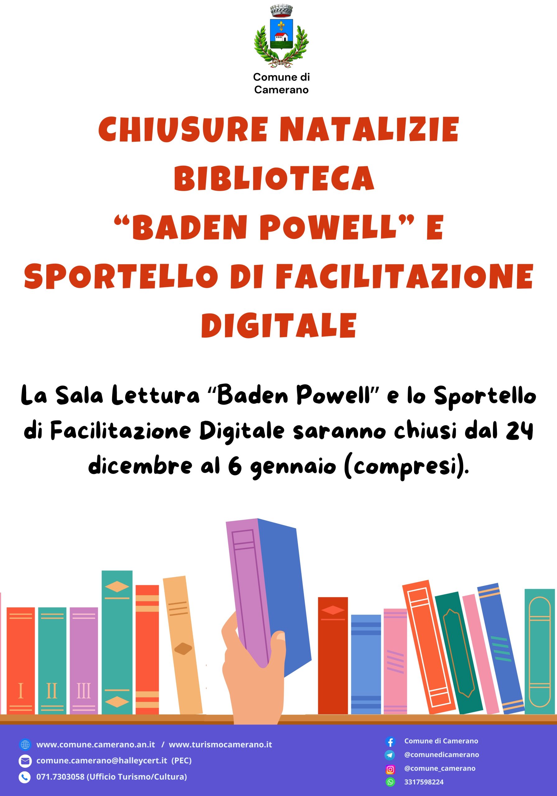 Si comunica che, nel periodo compreso tra il 24 dicembre 2025 e il 6 gennaio 2026 (compresi), la Sala Lettura “Baden Powell” e lo Sportello di Facilitazione Digitale resteranno chiusi al pubblico.