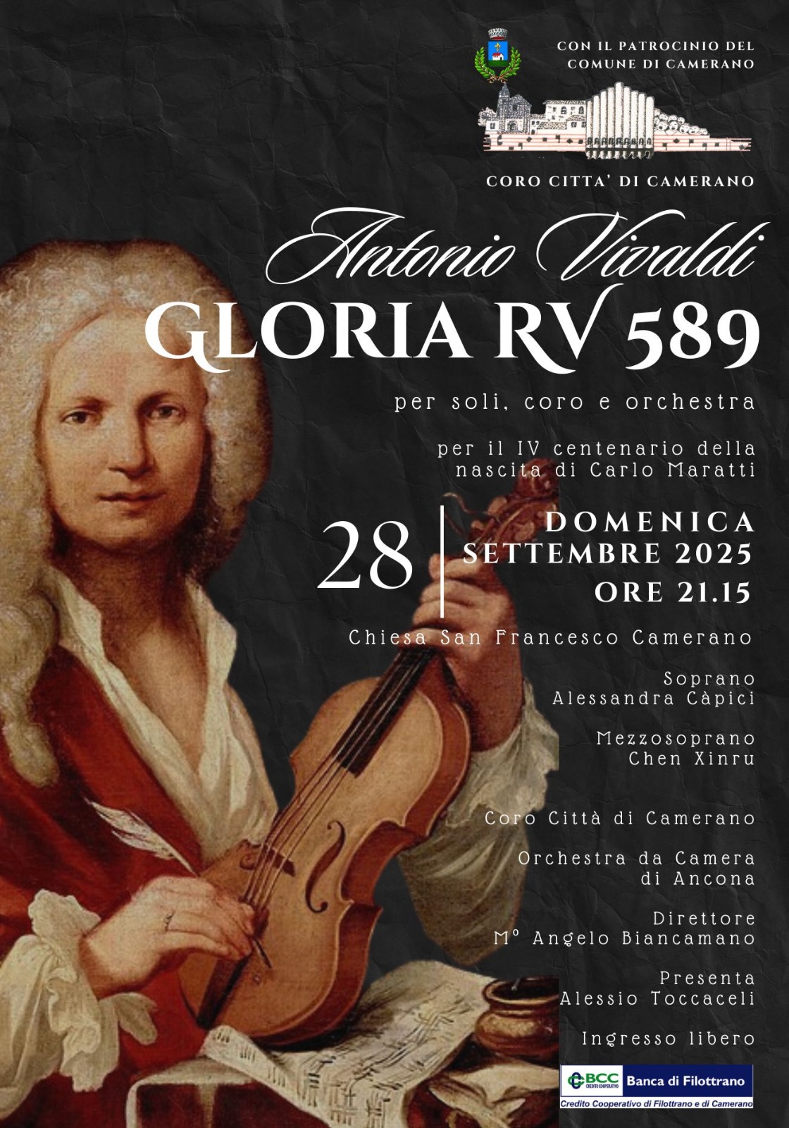 Il Coro Città di Camerano, insieme all’Orchestra da Camera di Ancona, eseguirà il Gloria RV 589 di Antonio Vivaldi, una delle composizioni più significative e apprezzate del repertorio barocco.