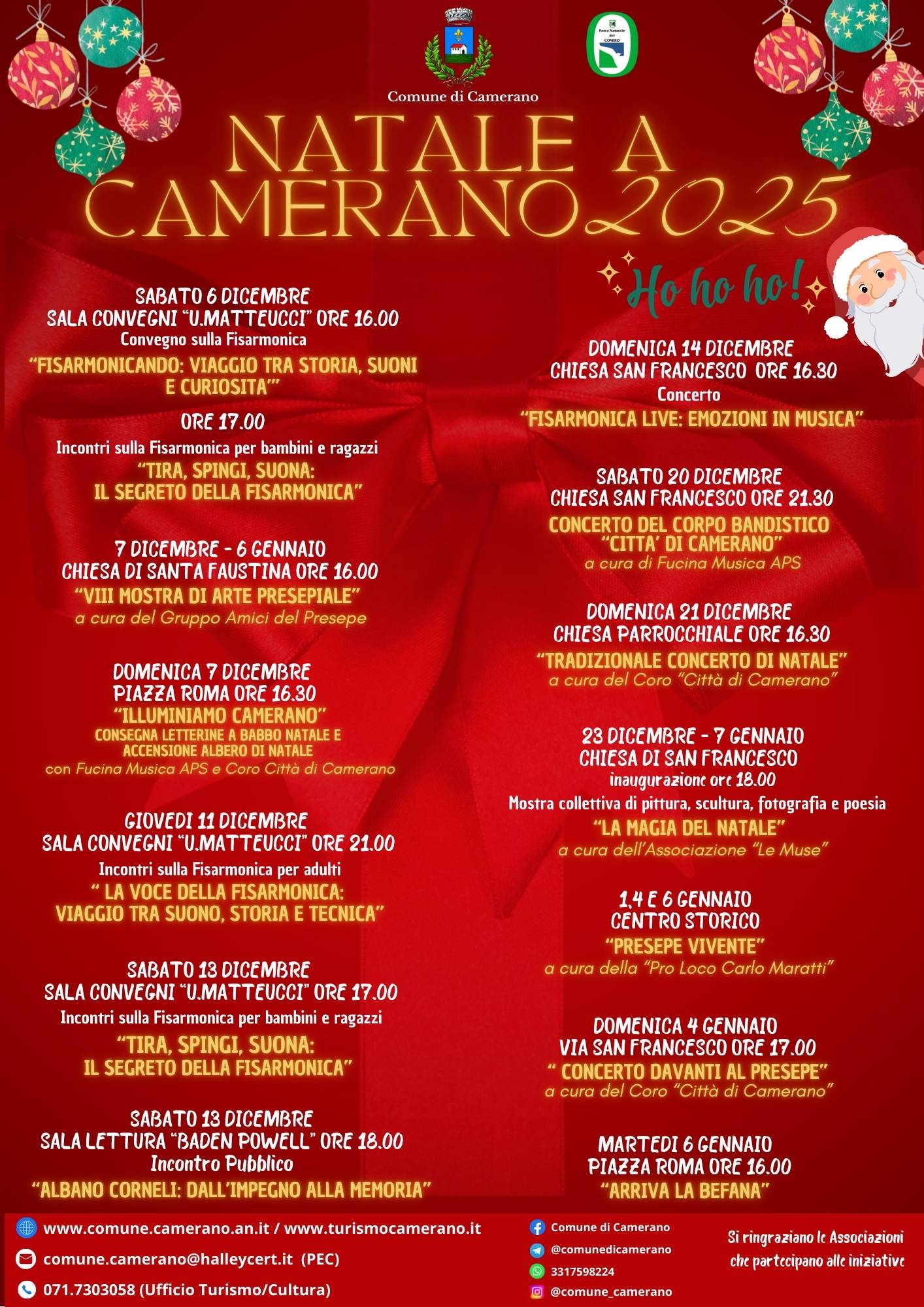 Il Comune di Camerano invita la cittadinanza a partecipare al programma di iniziative dedicate alle festività natalizie, un calendario ricco di appuntamenti culturali, musicali e tradizionali che si svolgeranno dal 6 dicembre 2025 al 6 gennaio 2026 grazie anche alla collaborazione delle associazioni locali.