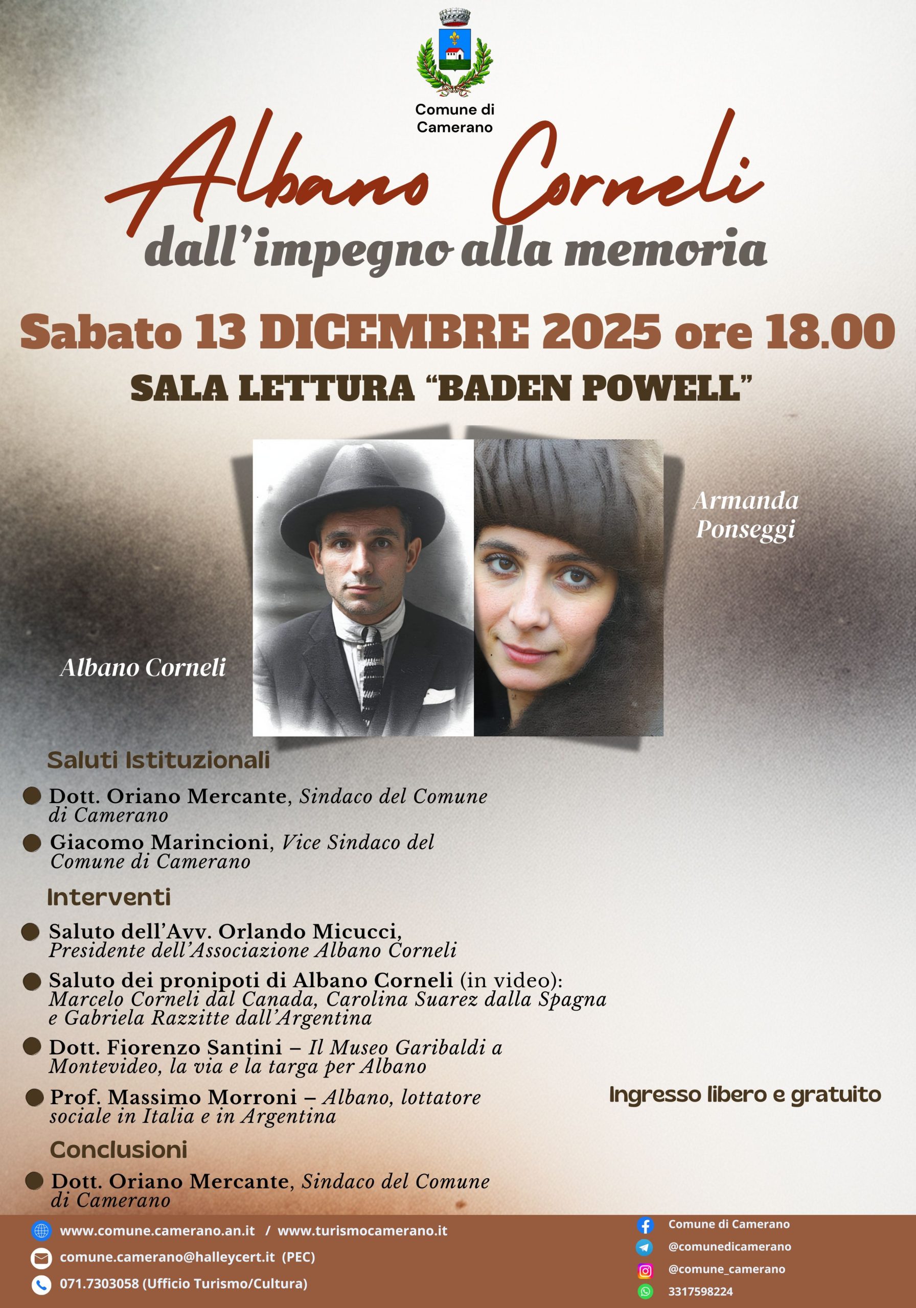 L’iniziativa, dedicata alla figura di Albano Corneli e al valore della sua testimonianza civile, prevede i saluti istituzionali del Sindaco Dott. Oriano Mercante e del Vice Sindaco Giacomo Marincioni, seguiti dagli interventi dell’Avv. Orlando Micucci, Presidente dell’Associazione Albano Corneli, dei pronipoti di Corneli con contributi video dall’estero, del Dott. Fiorenzo Santini del Museo Garibaldi di Montevideo e del Prof. Massimo Morroni, che approfondirà il ruolo di Albano Corneli come lottatore sociale in Italia e in Argentina.