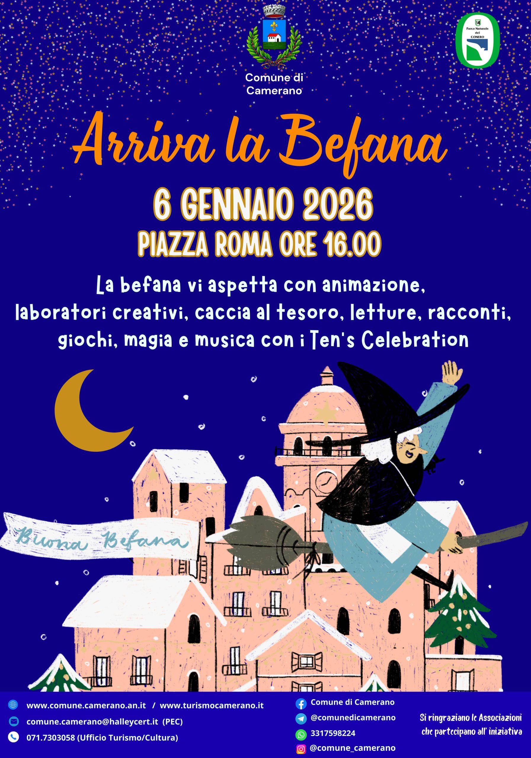 Il Comune di Camerano invita la cittadinanza a partecipare all’iniziativa “Arriva la Befana”, che si terrà martedì 6 gennaio 2026, alle ore 16.00 in Piazza Roma.