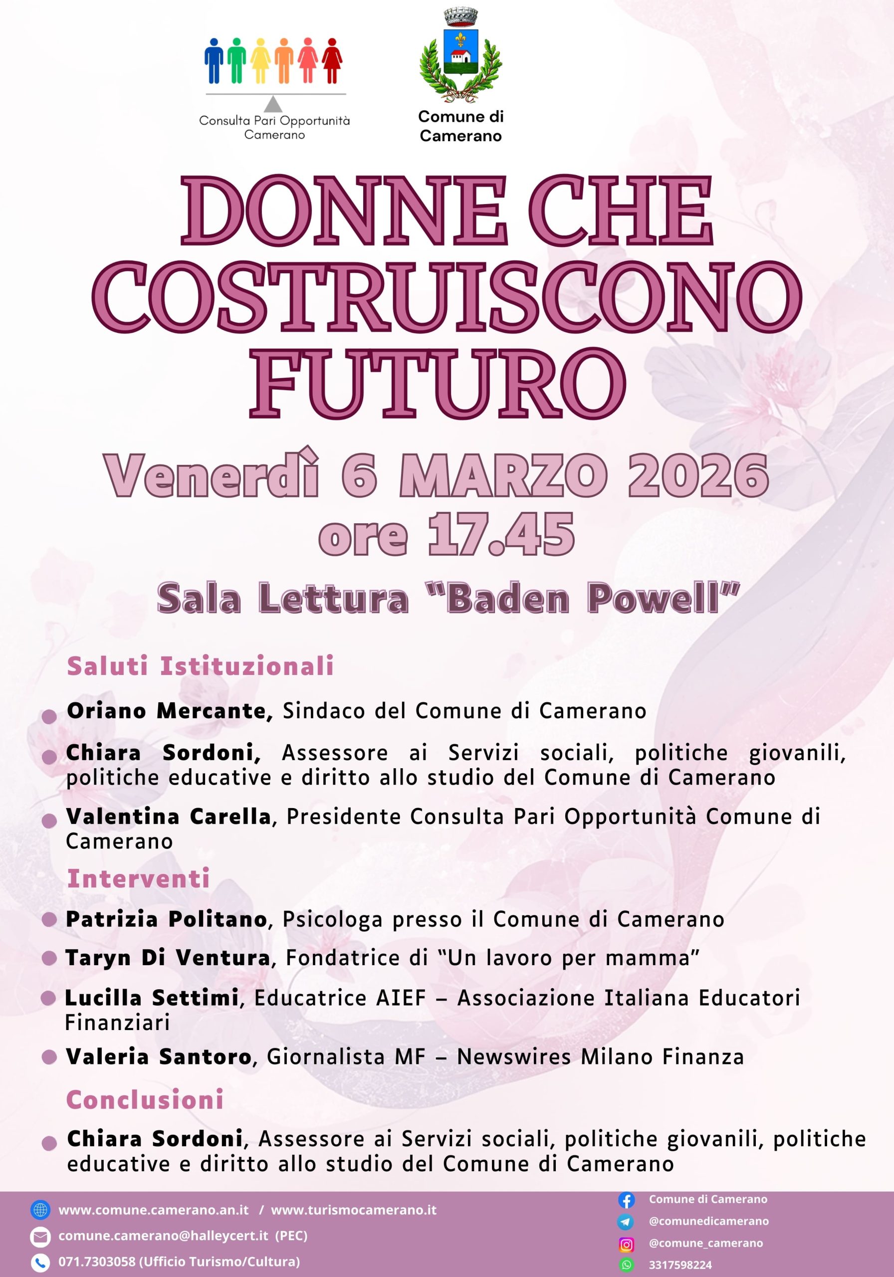 In occasione della Giornata Internazionale della Donna, il Comune di Camerano, in collaborazione con la Consulta Pari Opportunità invita la cittadinanza all’incontro pubblico “Donne che costruiscono futuro”, in programma venerdì 6 marzo 2026 alle ore 17.45, presso la Sala Lettura “Baden Powell”, un momento di confronto e riflessione dedicato al ruolo delle donne nella società, nel lavoro e nella costruzione di nuove prospettive per le giovani generazioni.