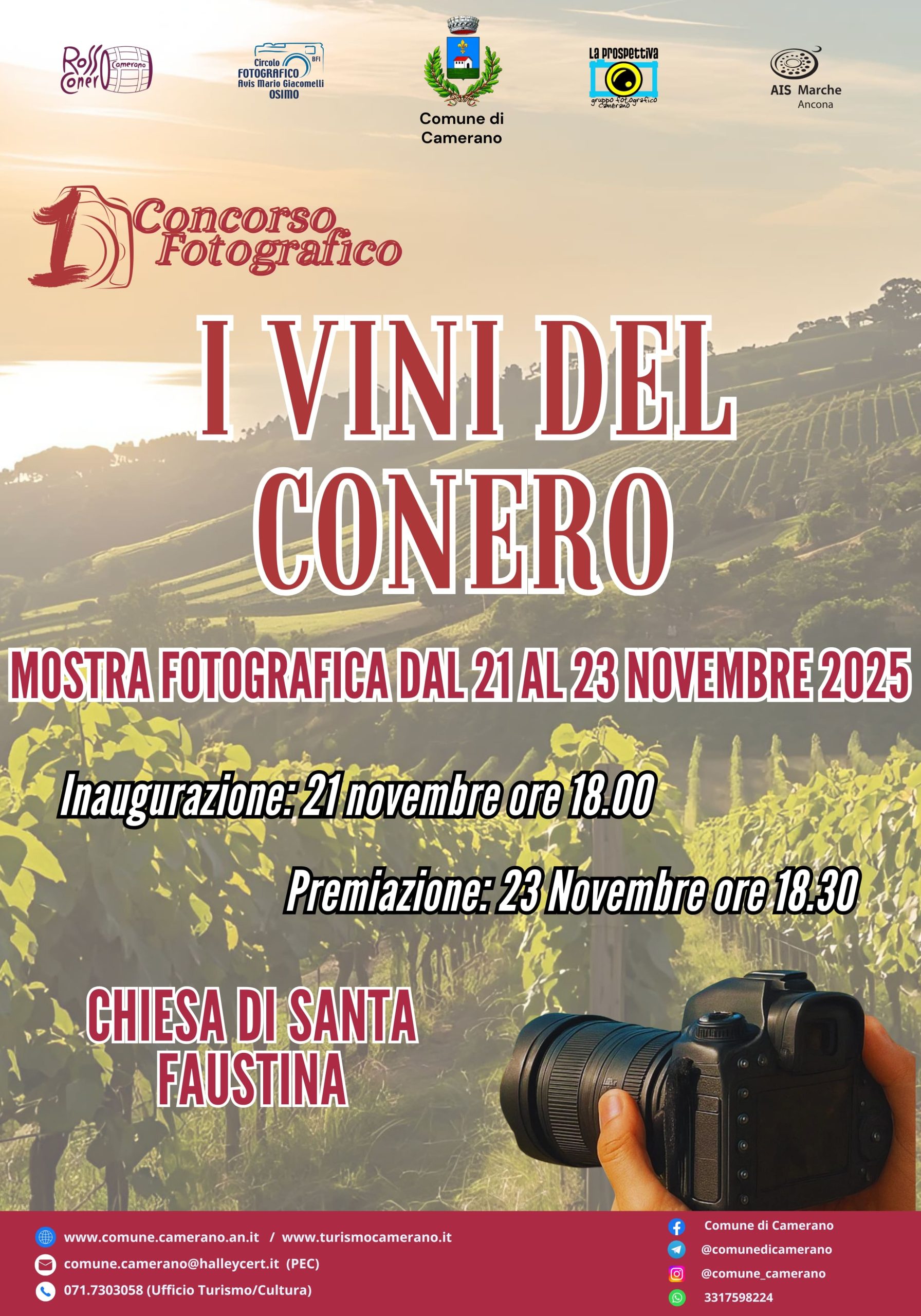 Il Comune di Camerano invita la cittadinanza alla premiazione della mostra fotografica “I Vini del Conero”, che si terrà domenica 23 novembre 2025 alle ore 18.30 presso la Chiesa di Santa Faustina.