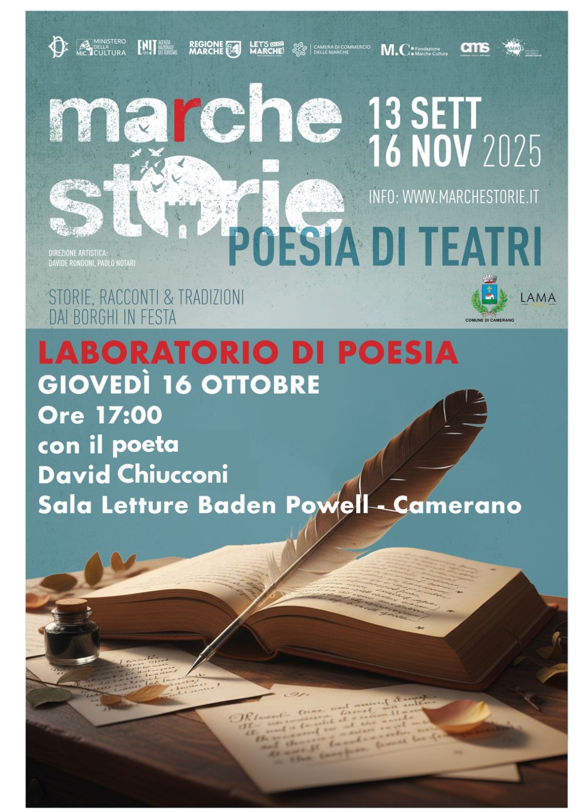 Il Comune di Camerano invita la cittadinanza a partecipare al Laboratorio di Poesia con il poeta David Chiucchioni, in programma giovedì 16 ottobre 2025 alle ore 17:00 presso la Sala Letture Baden Powell di Camerano.