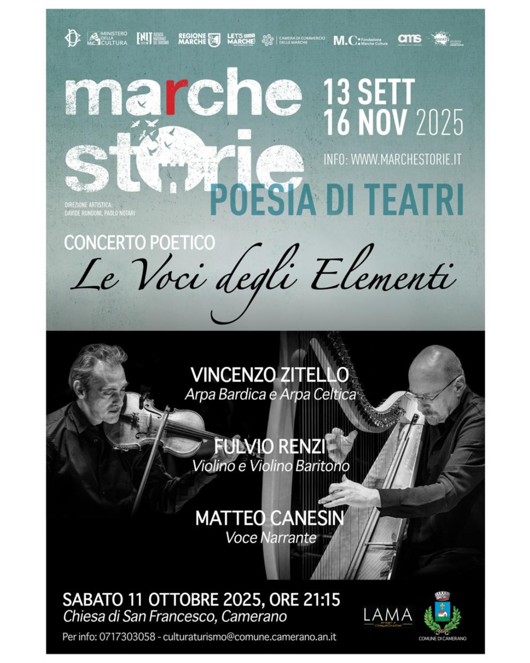 Nella splendida cornice della Chiesa di San Francesco di Camerano, sabato 11 ottobre 2025, alle ore 21.15, si terrà il concerto poetico "Le Voci degli Elementi", realizzato dall'Associazione Culturale Lama con la partecipazione di Vincenzo Zitello, Fulvio Renzi e Matteo Canesin.